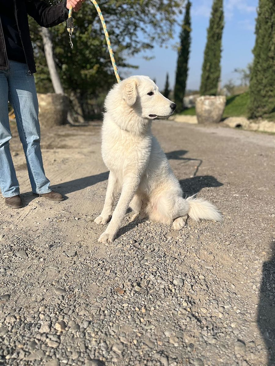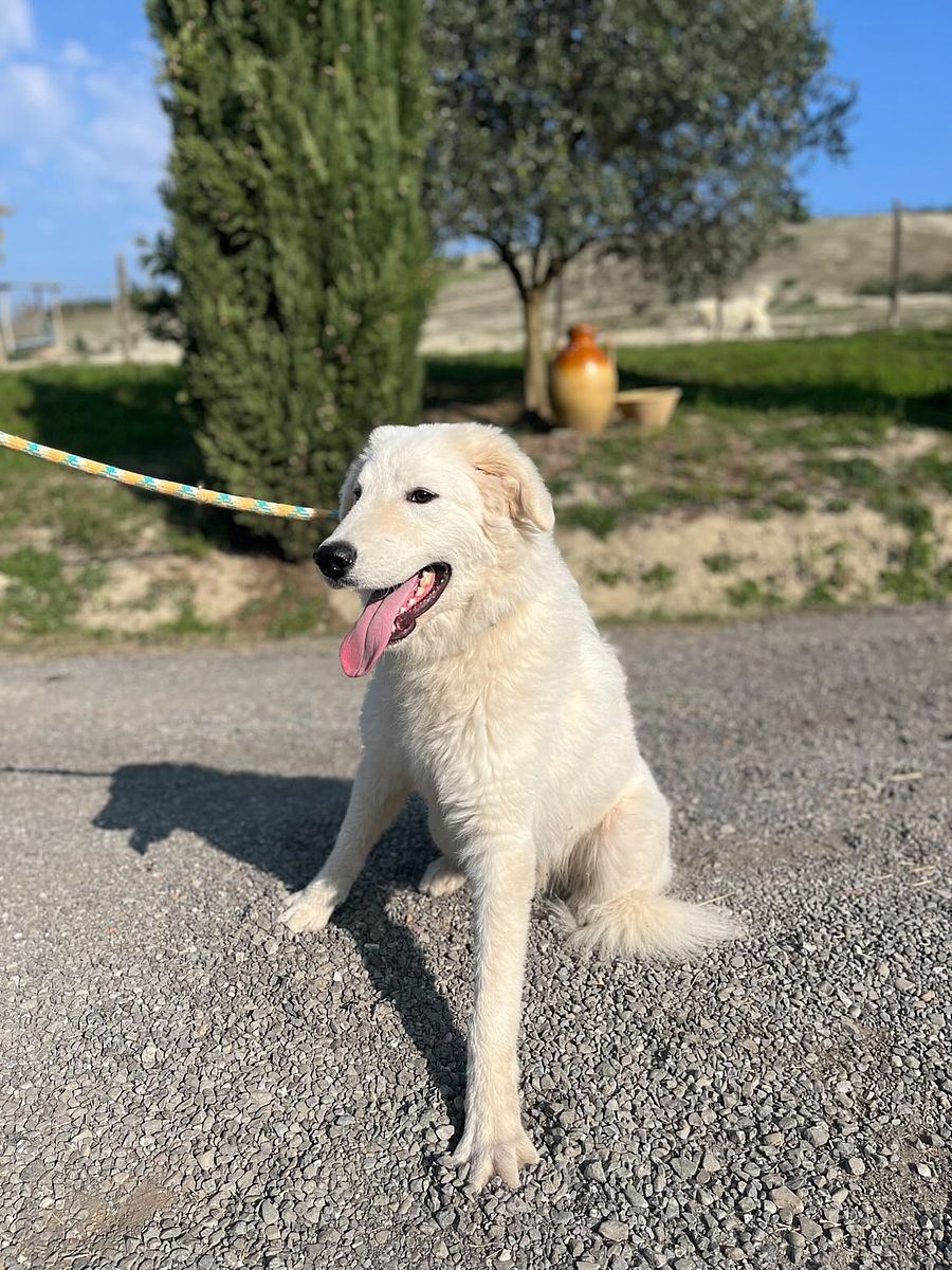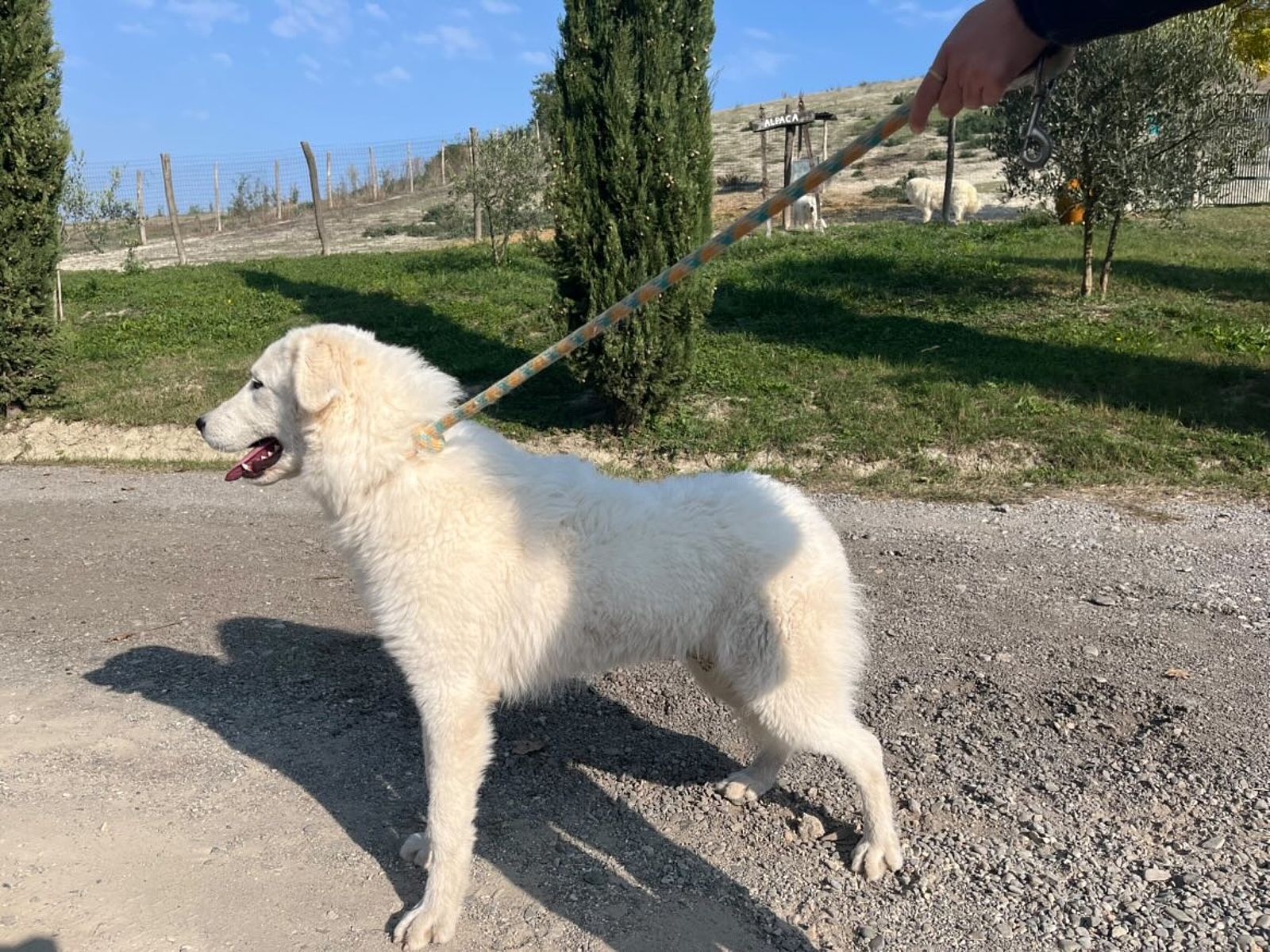 Campagnolo is a young Maremma Abruzzese sheepdog, almost one year old, a large puppy with a summer coat, less dense than in the cold season. He has a correct and complete dentition with scissors bite, and his testicles are descended into the scrotum.
