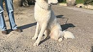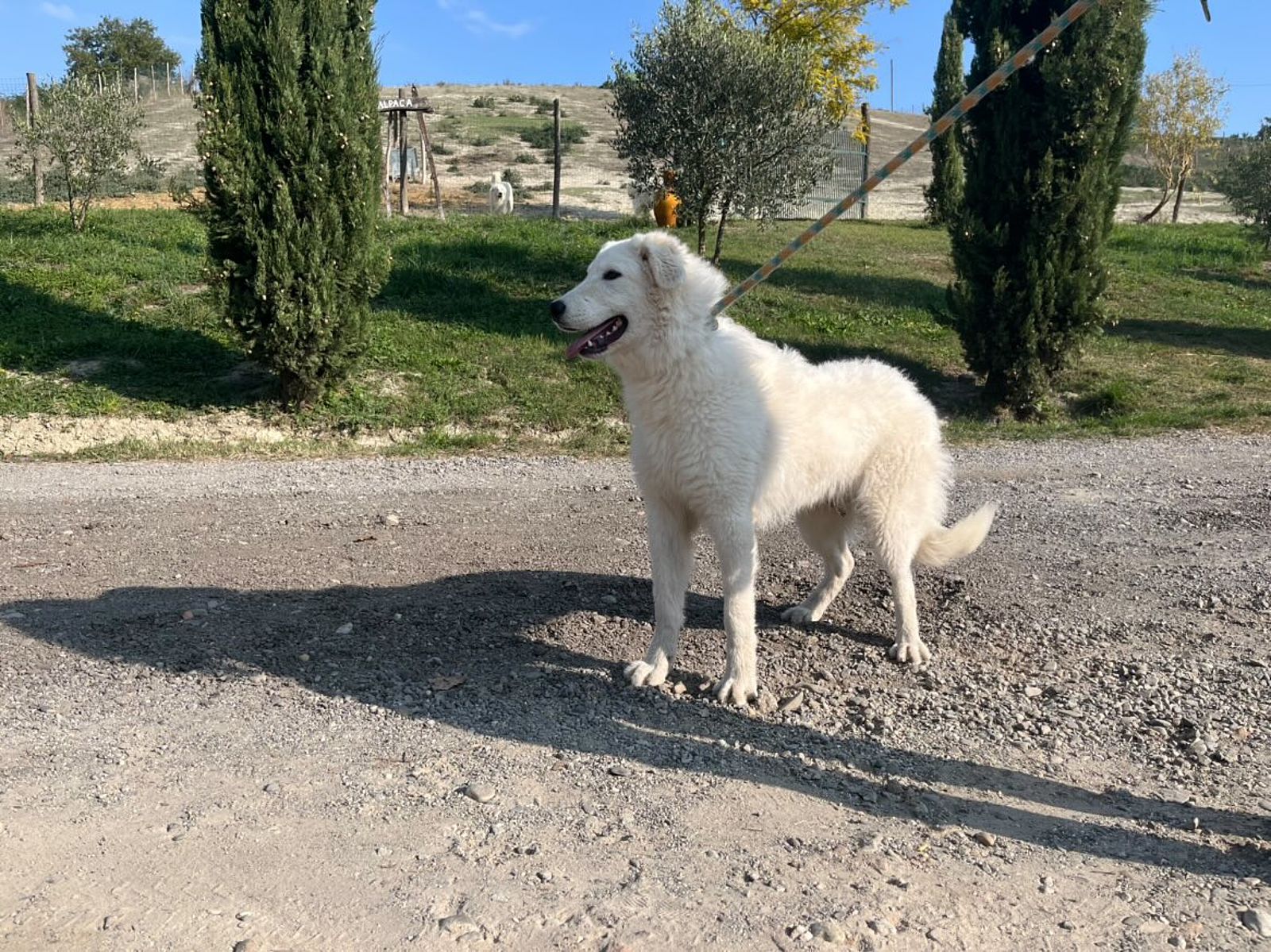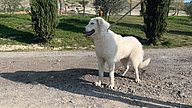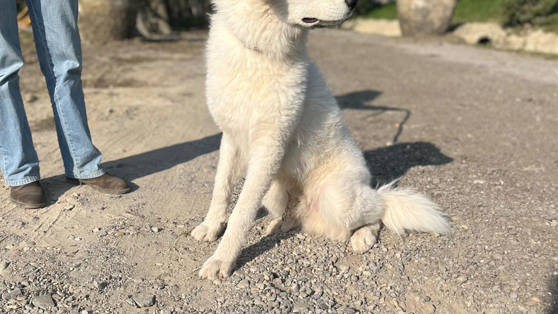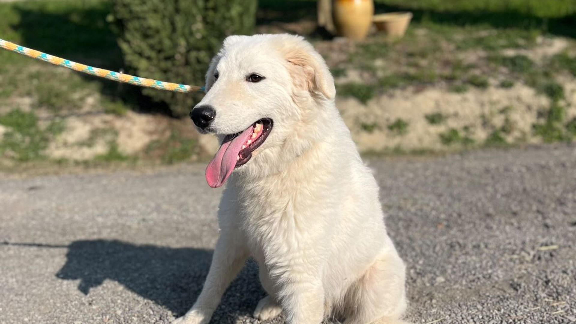 Campagnolo is a young Maremma Abruzzese sheepdog, almost one year old, a large puppy with a summer coat, less dense than in the cold season. He has a correct and complete dentition with scissors bite, and his testicles are descended into the scrotum.