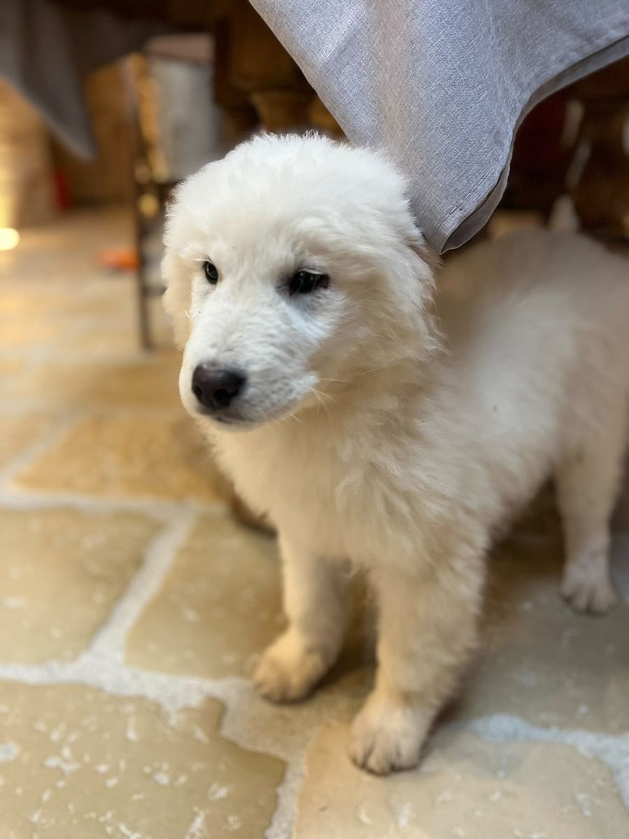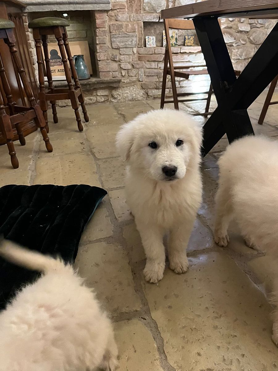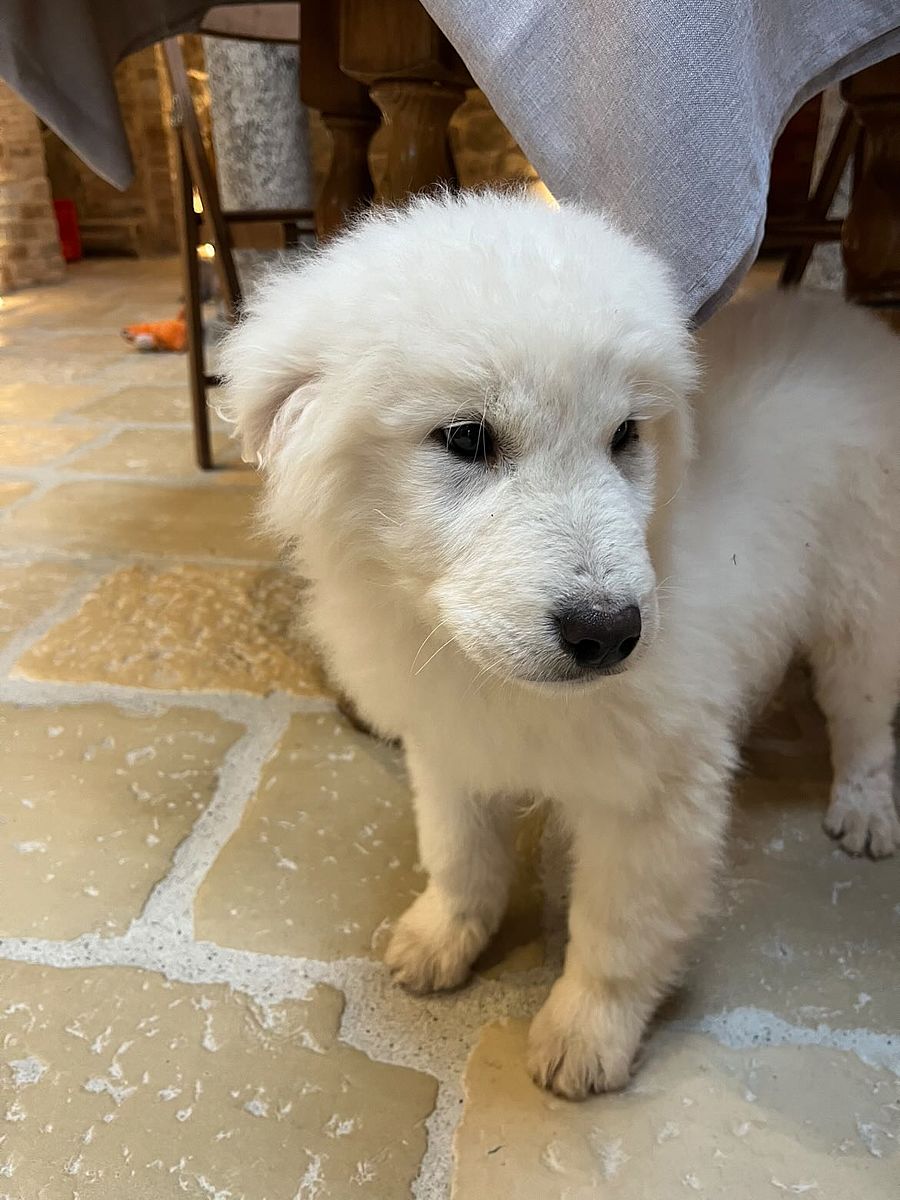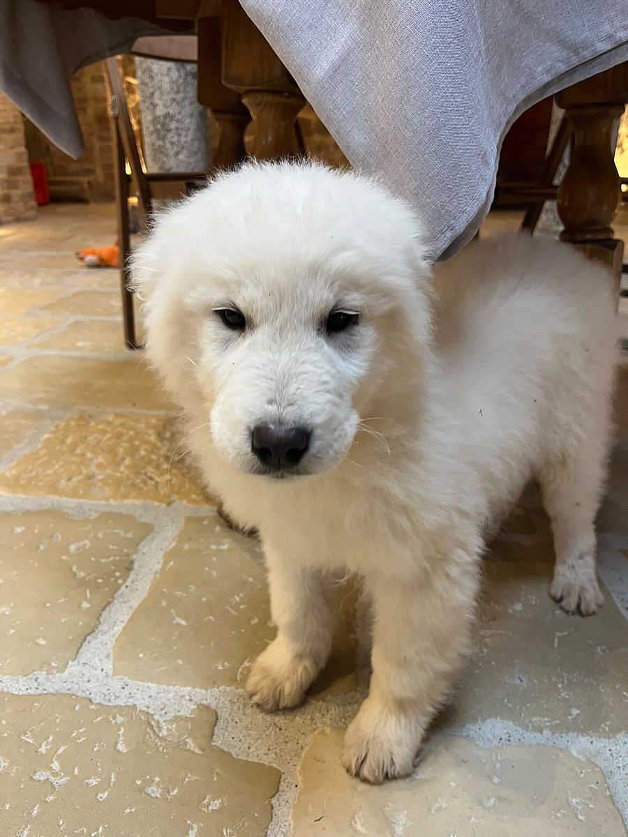 The coat is white, in accordance with the standard, with correct pigmentation that enhances the Maremma Sheepdog's typical, proud expression. His structure, already well-established at a young age, suggests significant and harmonious development, with the potential to become an imposing, solid, and well-proportioned dog.