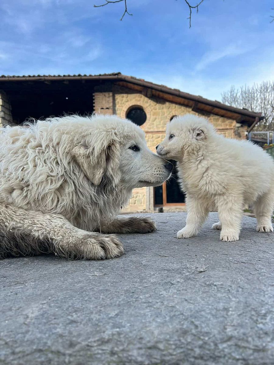 Daughter of mother Polissena and father Gennaro, Kea comes from two parents who are true examples of the breed: typical subjects, structurally correct, with excellent bone structure, harmonious movement, and above all that balanced and watchful temperament that distinguishes the true Maremma Abruzzese Sheepdog. Both parents fully express the functional characteristics of the breed, with a strong guarding instinct, great reliability, and stable character.