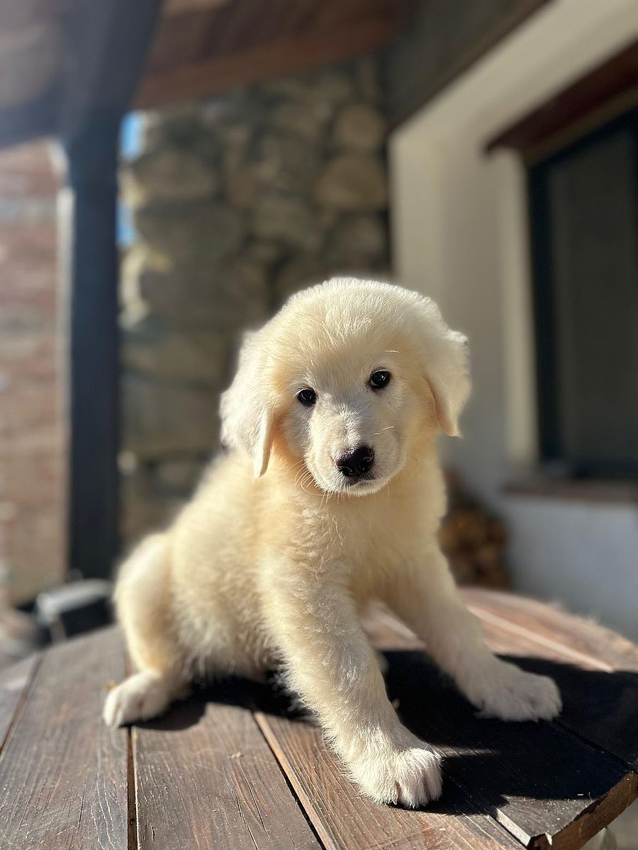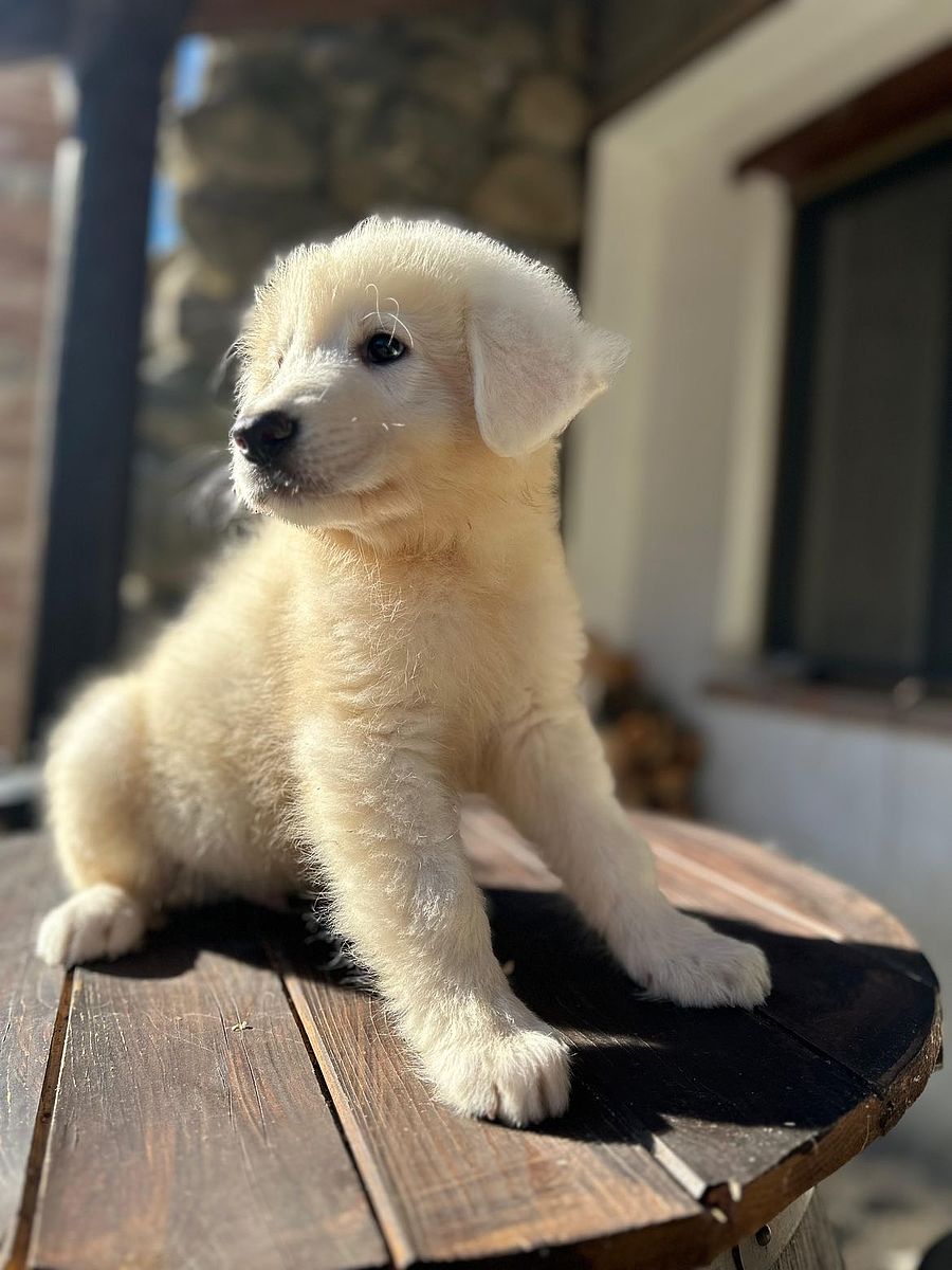 Three-month-old Maremmano Abruzzese Shepherd puppy, an exemplar of remarkable morphological and temperamental typicity. He presents a harmonious and well-proportioned structure, already robust for his young age, with solid bone and a natural bearing that reveals the future grandeur typical of the breed.