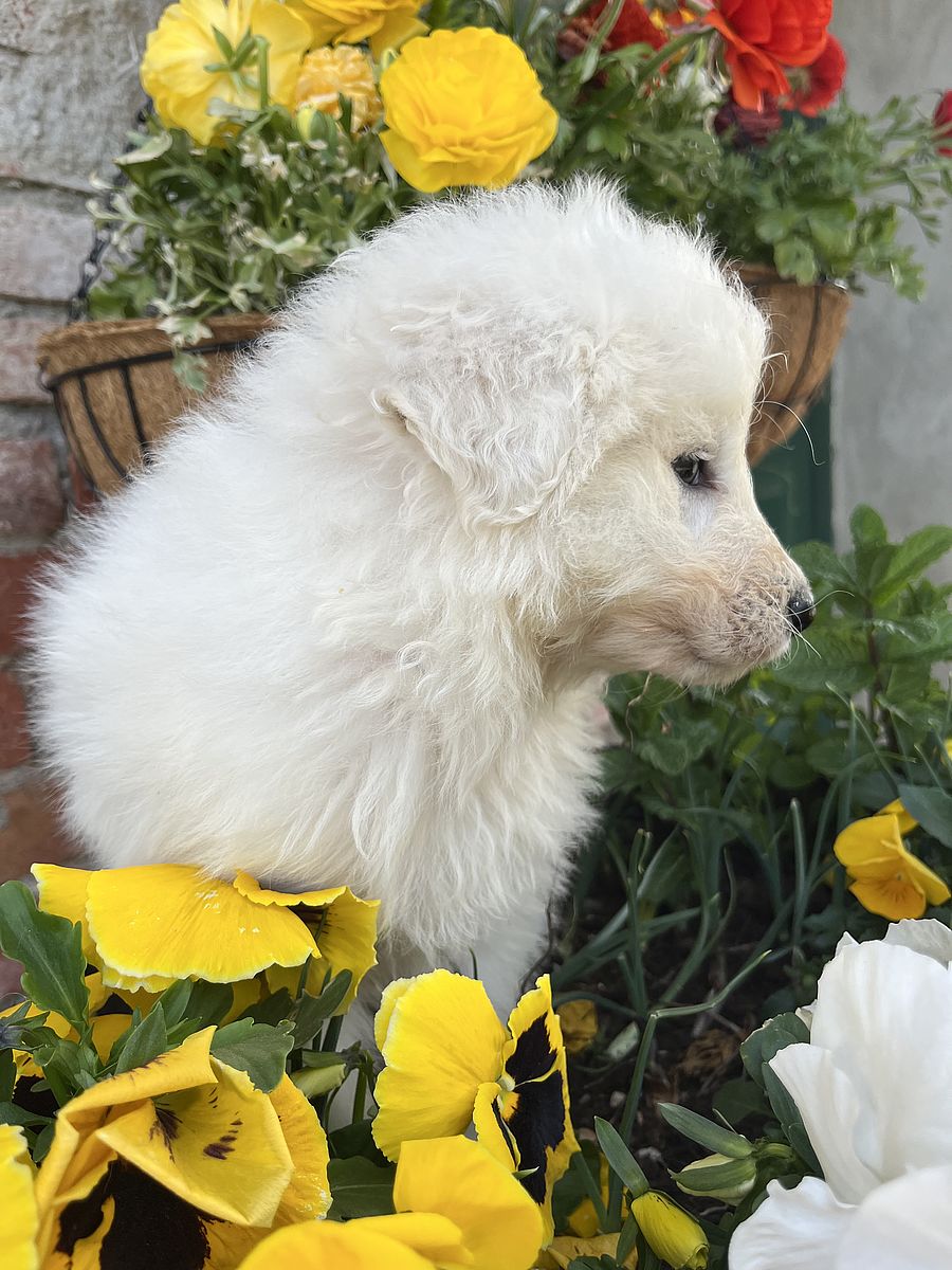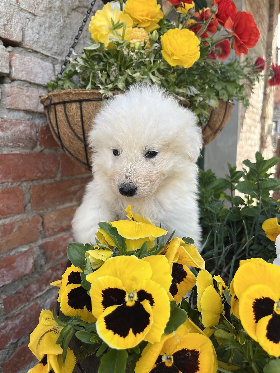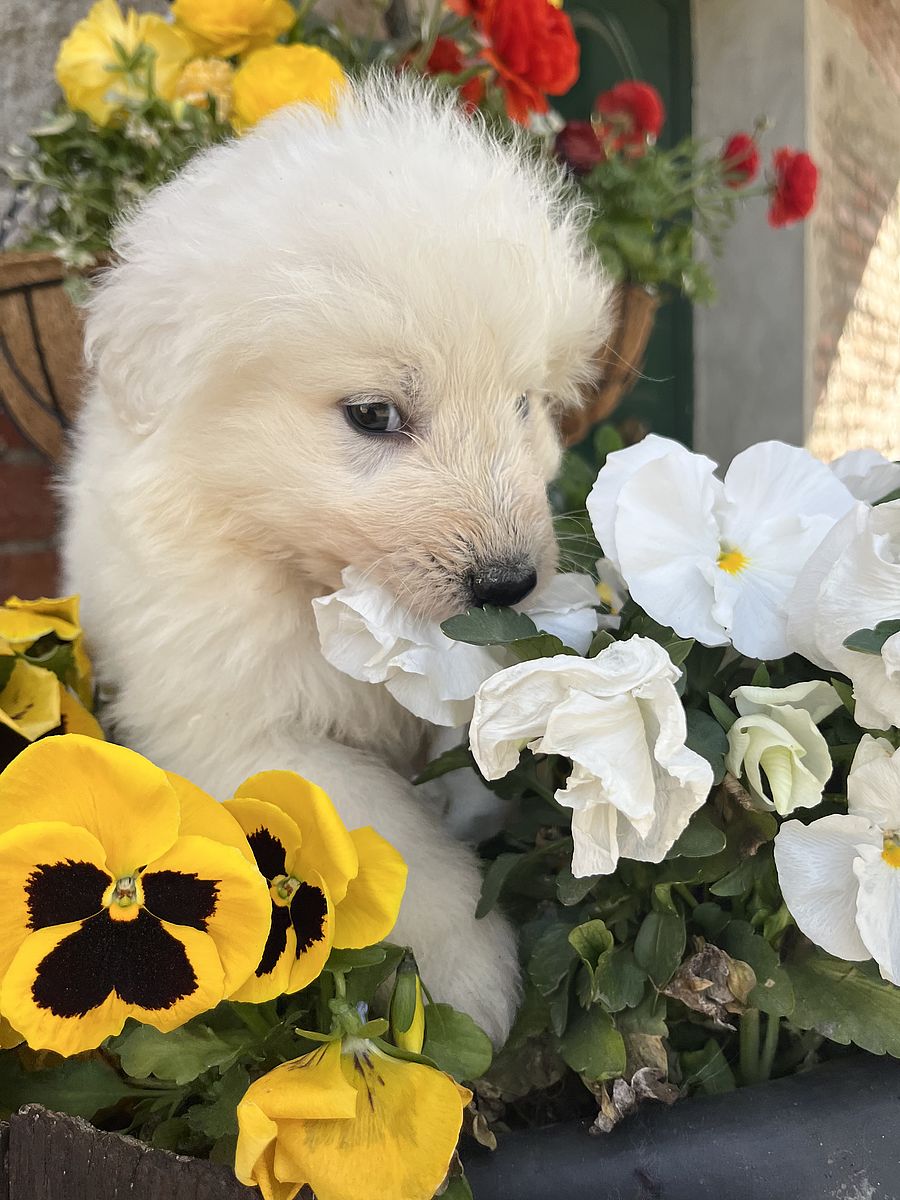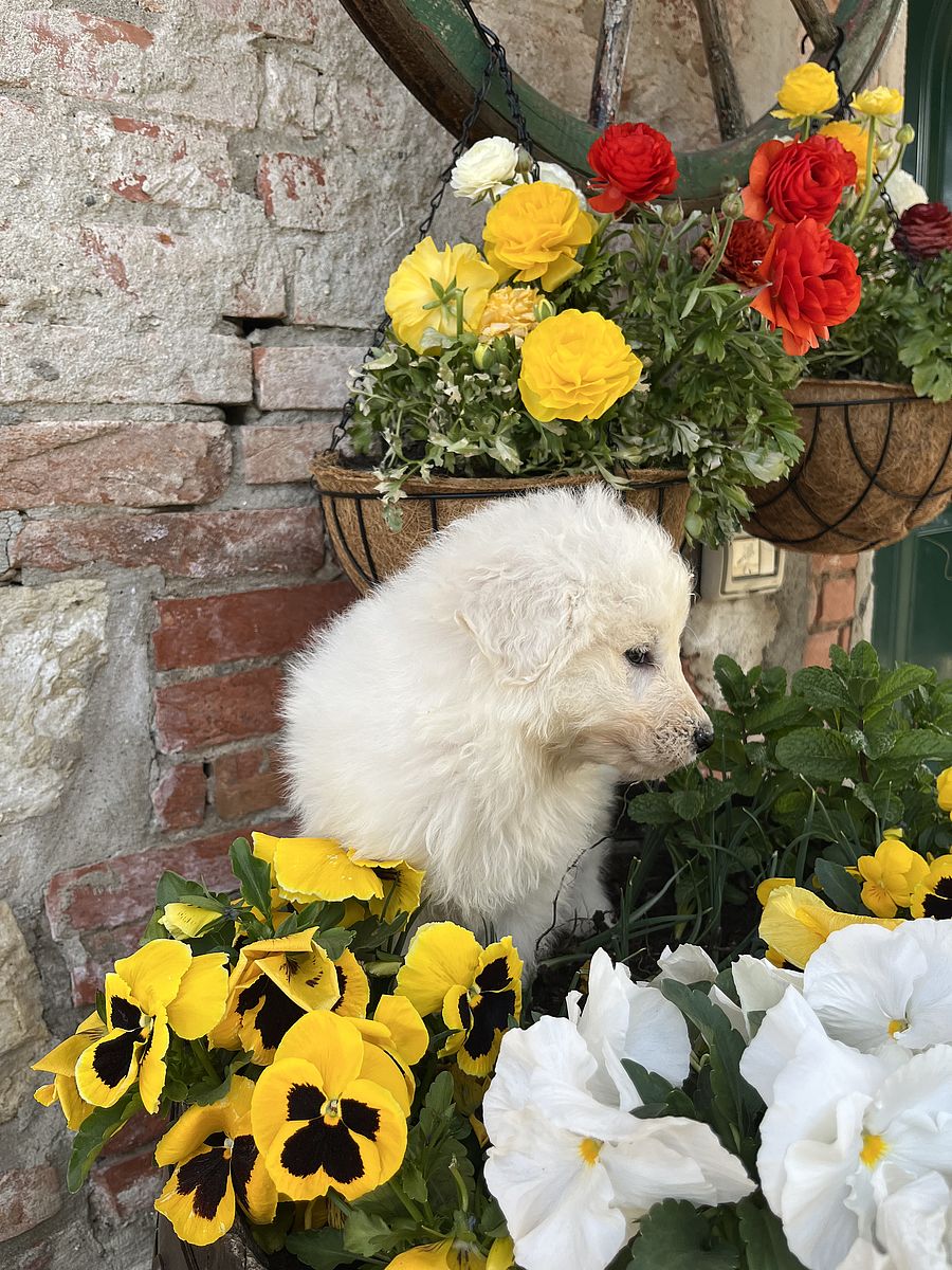 Partenope is a young female Maremma Sheepdog, daughter of Eduardo Brancamenta, bred in a breeding line that focuses on functionality and balanced temperament.