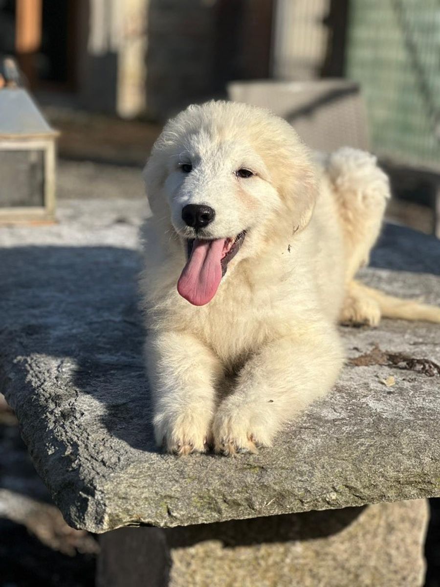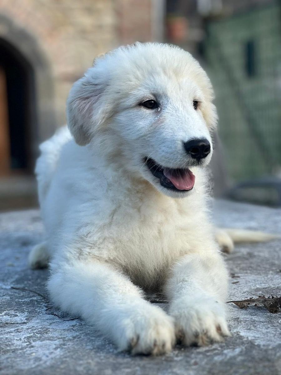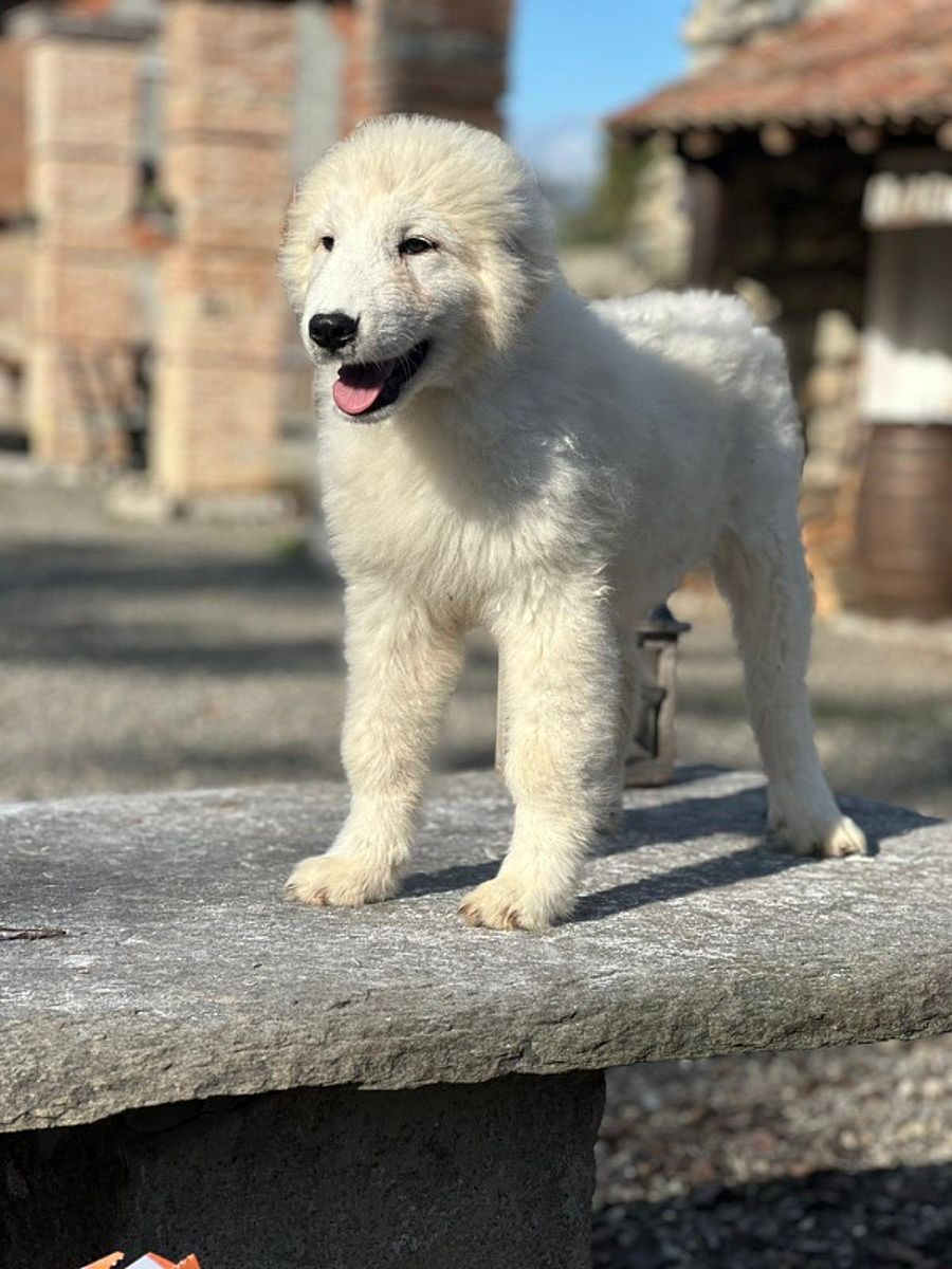 Valge is an excellent Maremmano Abruzzese Shepherd puppy, already well-defined with a strong and harmonious head, featuring the typical cone-shaped skull that distinguishes the breed. His expression is authentically Maremmano—proud and alert—a quality he inherits from his father Dauno, a dog of great breed-typicality.